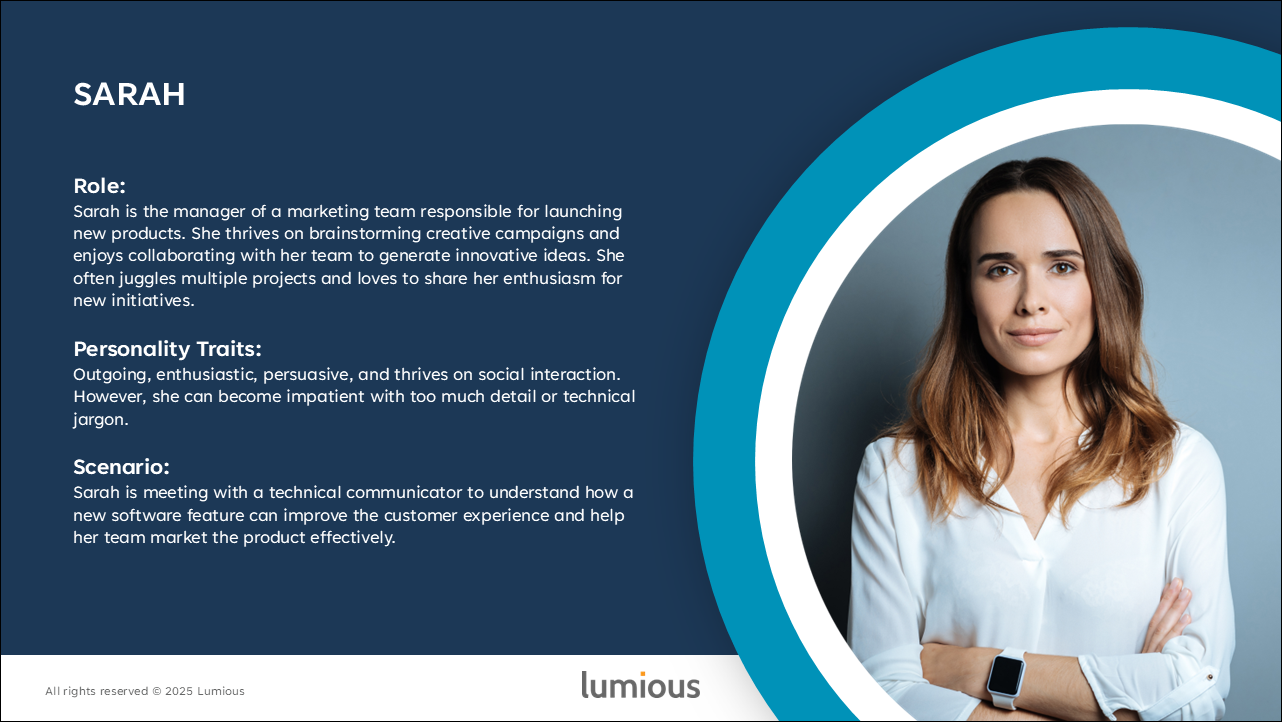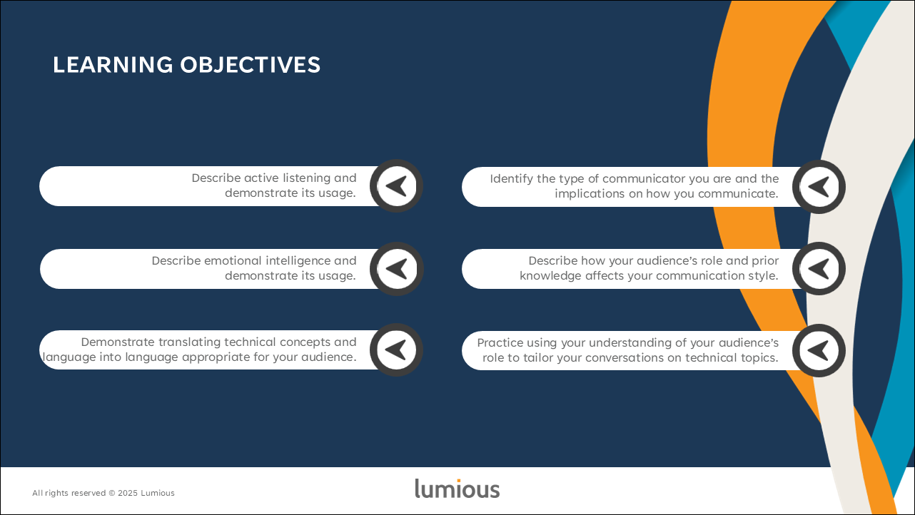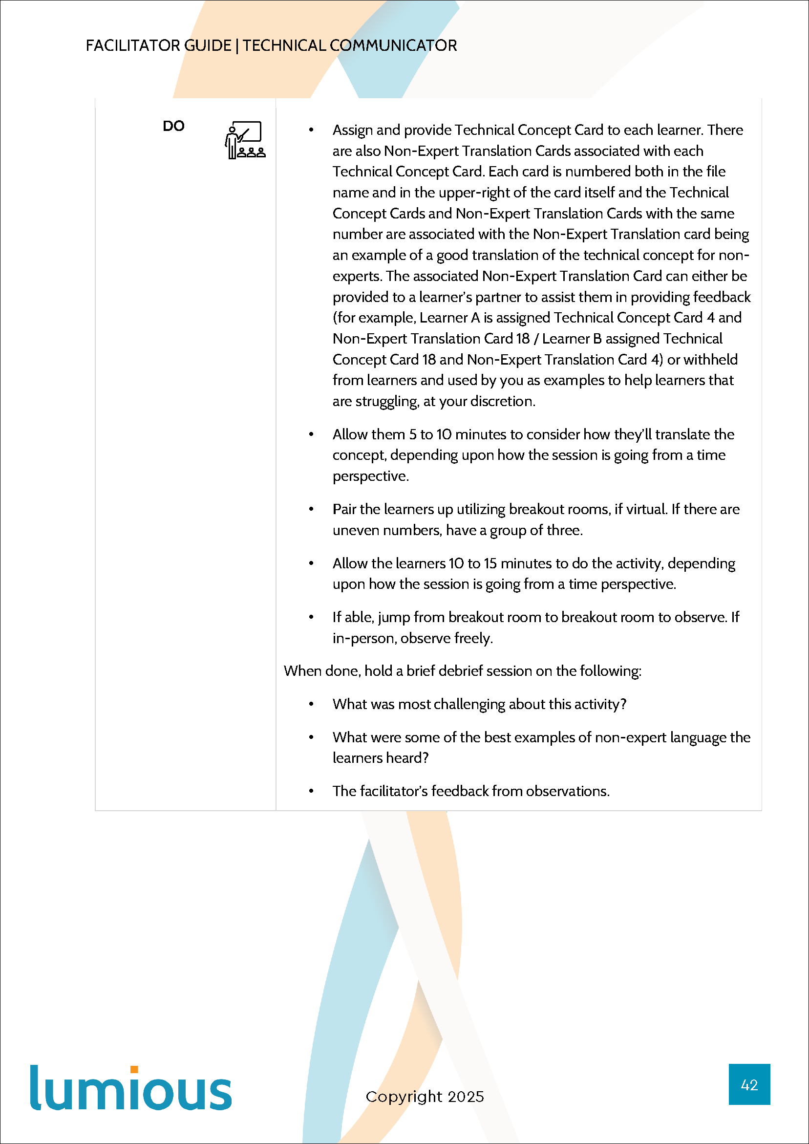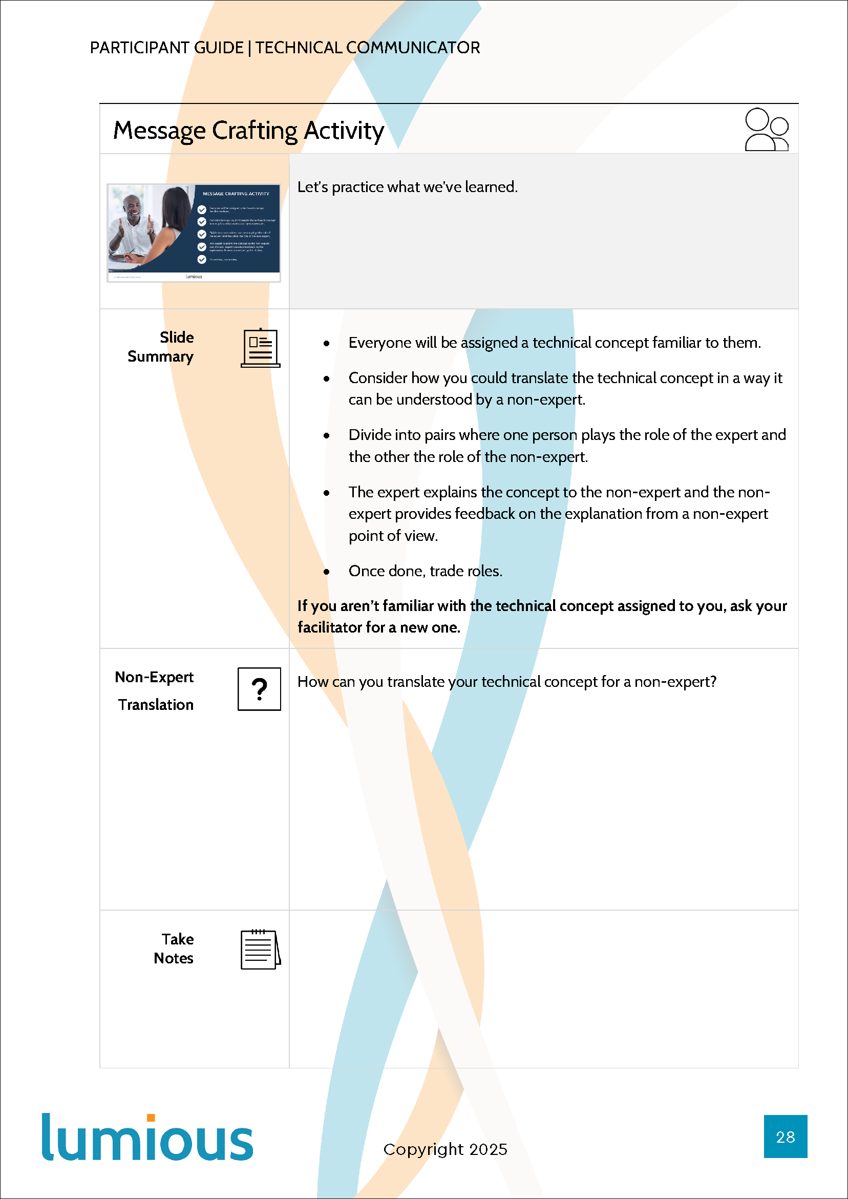 The samples below are from an ILT/VILT course called Technical Communicator. In full, it is an eight hour course for those in highly technical roles having technical conversations with non-technical stakeholders with a goal of being able to communicate technical concepts in a way that is meaningful and relevant to the stakeholder.