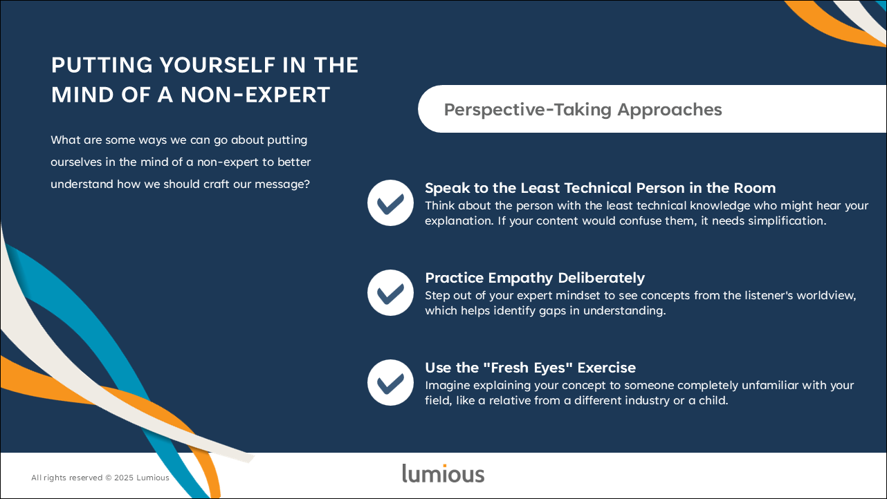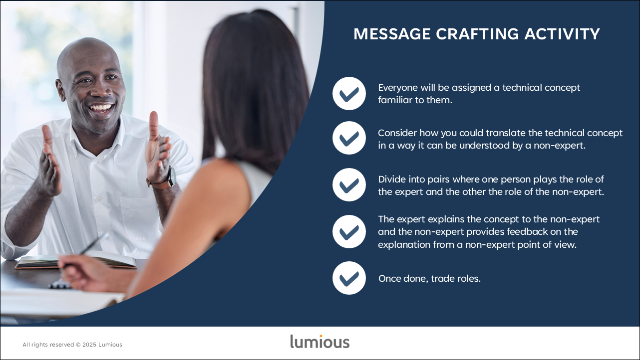 Learners went over various strategies to translate technical jargon into “everyday” speak for non-experts by using perspective-taking approaches, analogies, relatable examples, and everyday language.